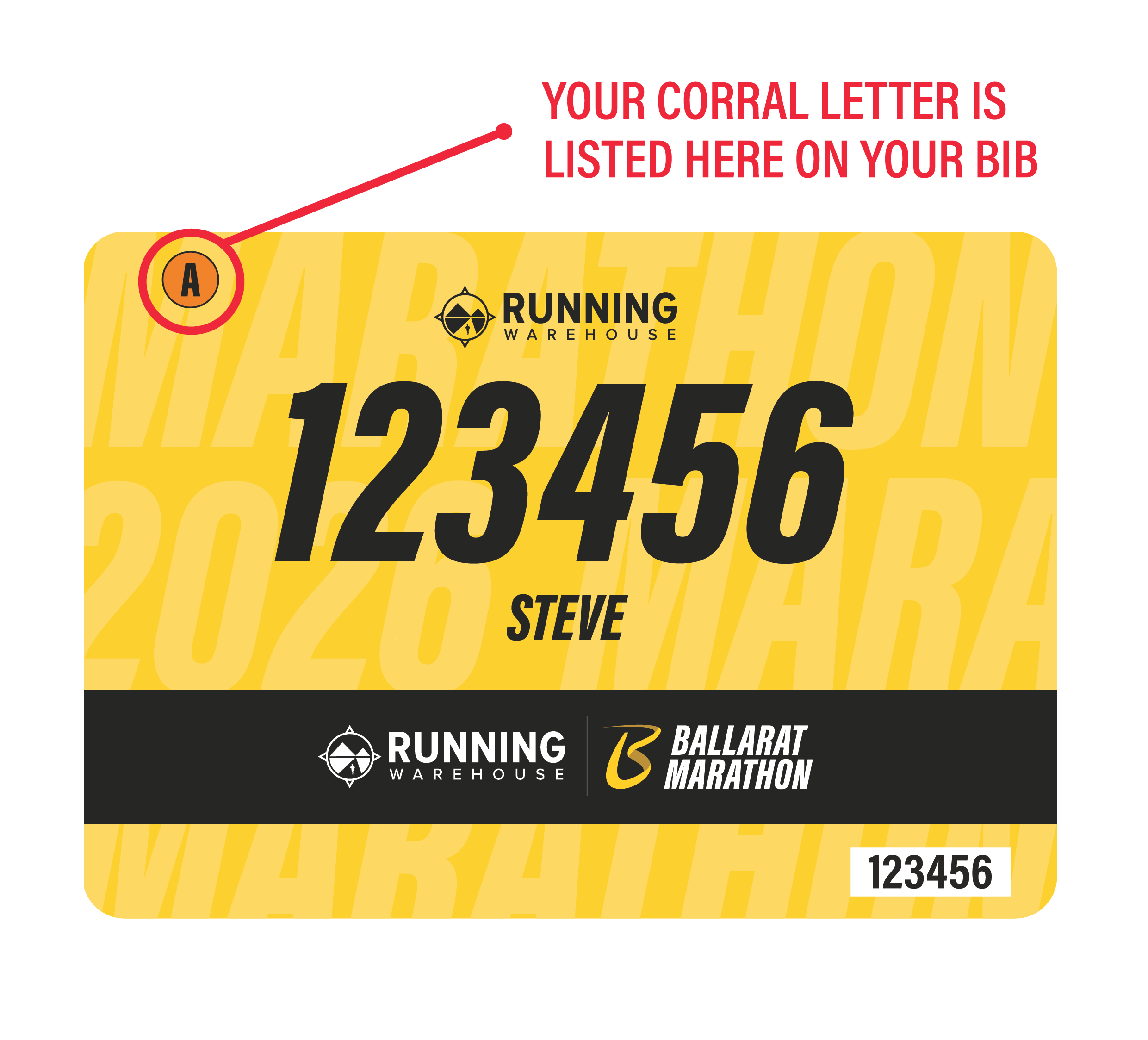 Each runner’s assigned corral is indicated by a letter on their bib.